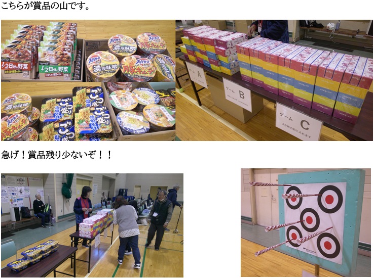当日は途中から雨も降りだし雪も混ざり出しましたが、暖房のある体育室内で暖かく楽しく3種類のゲームを行い、賞品をゲットしました。また、腕試しとして12m、14m、15m、16mの的を用意して挑戦して貰いました。
